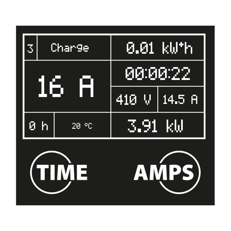 Nabíjecí proud lze nastavit v rozsahu 6–16 A. Výchozí hodnota je 16 A a změna probíhá přímo tlačítkem AMPS na stanici.